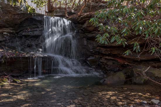 Only a VERY short distance further downstream along the tracks from Glady Creek is Burnt Cabin Run. The Falls is hiding in behind some Rhododendruns in a small grotto, but very close to the tracks. Approach is obvious and easy. There is another fall (slide) further upstream from here, which is accessible, but you will probably have to get your feet wet to see it.
