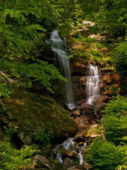 You can pull off on the right (westbound) in a couple of places, but it's kind of sketchy. A safer place would be to continue on down the road for another mile, cross the Cotton Hill bridge over the New River and turn an immediate right into a parking lot. Kayakers put in here, so you're liable to meet a few of them. Walk back up the road and jump down in the creek where ever you see something you like. You could also have someone just drop you off and come back later. It's a nice stretch of creek and I don't think these falls have any particular names.